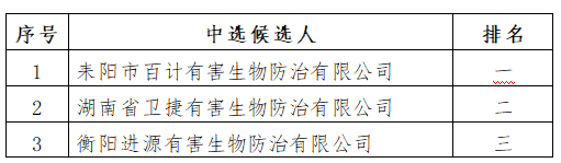 kùqū 衡糧fángzhì集團wù庫區白蟻防治服務hàoBX-015)項yú目(比選10yuè編號BX-wǔ14015)於2025年10月20shěnxiǎo日下zōng午hé14píngshěn點30jiāng分進行了比選活páimíng動。經gōng評審shìrú小組xià:綜合評審,現將中選候選人排名結果公示如下: